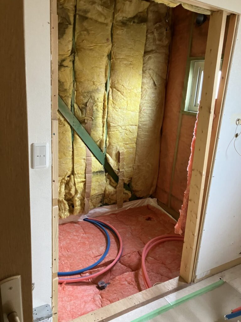 当社では床、天井にもグラスウールを入れます(新しく入れたグラスウールが赤色の物です)